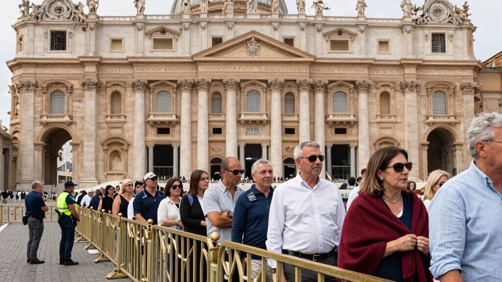 When attending papal audiences, it’s important to dress modestly and appropriately for the occasion, especially since these events often take place outdoors in St. Peter’s Square. Men should wear long pants and avoid tank tops or shorts, while women should opt for knee-length skirts, trousers, or dresses with covered shoulders. Even in warm weather, avoid sleeveless tops or revealing clothing. Hats are permitted outdoors but must be removed before entering indoor spaces. Remember, casual modest dress is expected, so avoid ripped jeans, tight clothing, or clothing with offensive graphics. Staying respectful of the setting guarantees a smooth experience. Keep your attire simple and conservative, and you’ll show proper reverence for this significant event.