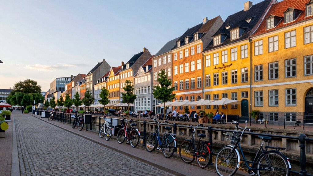 Getting around is effortless thanks to Copenhagen’s extensive bike-friendly infrastructure. You’ll hop on a rented bike and glide past colorful facades, lively squares, and tranquil canals. Cycling isn’t just a mode of transportation; it’s a way to experience the city’s rhythm intimately. The city’s dedication to bike lanes and rental stations makes it easy to navigate, allowing you to soak in the sights at your own pace. As you pedal along the waterways, you’ll notice the calmness of the canals contrasting with the city’s vibrant energy, offering moments of peaceful reflection amid urban activity.