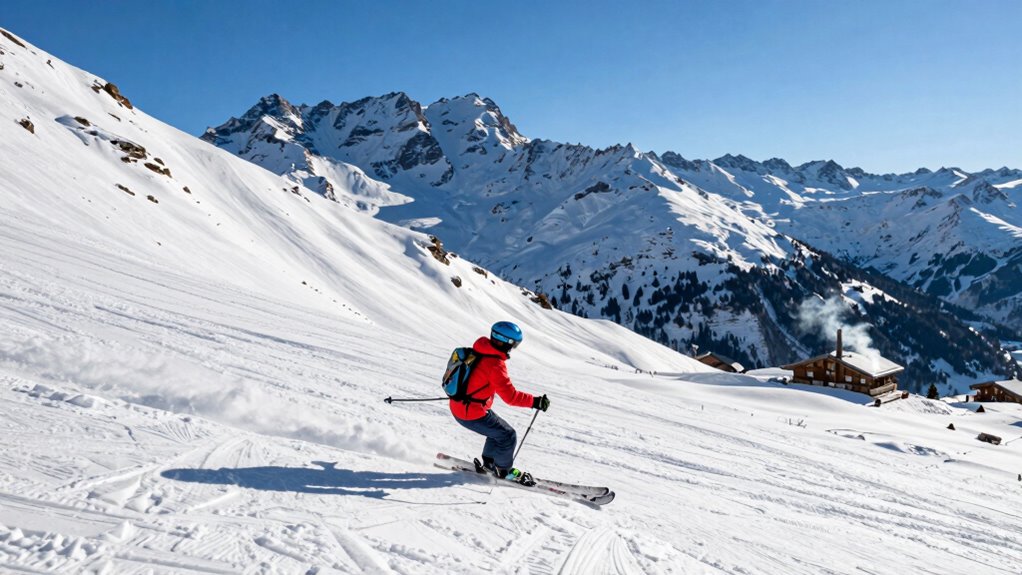 Have you ever wondered why European blue slopes can feel more challenging than North American greens? It’s mainly because they tend to be steeper, narrower, and more technical. While North American greens prioritize wide, gentle terrain, European blue runs often require better control and technique. Resorts like Kitzbüheler Horn offer wide, gentle slopes and dedicated beginner zones, but many other areas feature more moderate inclines that can surprise newcomers. Garmisch-Partenkirchen’s Hausberg area, for example, provides confidence-building runs with magic carpets, yet the terrain still demands attentiveness. Zugspitze’s glacier offers wide, straight blue runs that require little maneuvering. As a beginner, expect some slopes to be steeper than your typical North American green, so take your time and choose terrain carefully to build confidence safely. Additionally, understanding the terrain and slope difficulty can help you select appropriate runs and avoid unnecessary challenges. Being aware of slope grading systems used in Europe versus North America can further aid in choosing suitable terrain.