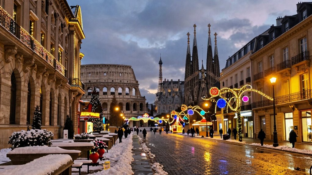 You’ll love the unique holiday events in each city. Paris dazzles with its iconic Christmas markets along the Champs-Élysées, perfect for romantic strolls. Rome offers festive piazzas, churches, and historic squares, immersing you in centuries of tradition. Barcelona’s lively street parties and Catalan traditions create vibrant New Year celebrations. No matter which city you choose, you’ll experience unforgettable festivals that highlight each place’s distinct holiday charm.