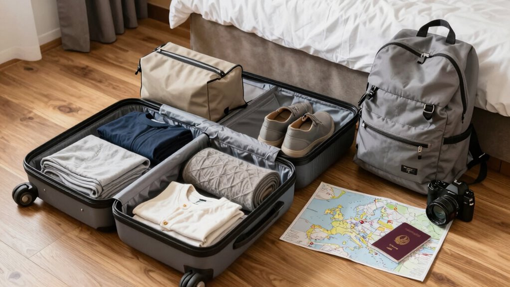 Layering your accessories is essential for staying comfortable and stylish as temperatures fluctuate during your European trip. You want to adapt quickly to changing weather without overpacking. First, pack a versatile scarf that can double as a shawl or head covering for religious sites. Next, include a wide-brim hat for sun protection or added warmth during chilly days. Finally, choose a compact pair of gloves and a beanie for cold mornings or evenings. These accessories not only keep you comfortable but also add style to your outfits. They’re lightweight, easy to pack, and serve multiple purposes. By mastering this layer of your wardrobe, you’ll stay prepared for seasonal shifts without cluttering your luggage. Incorporating multi-purpose accessories into your packing strategy maximizes space and functionality.