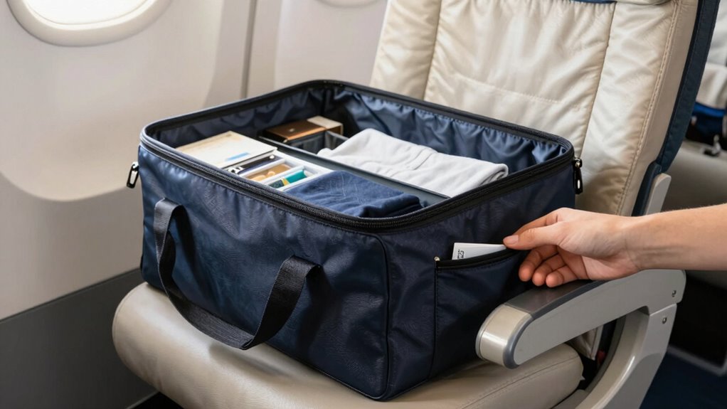 Think of your underseat bag as a tiny treasure chest, but even small treasures face restrictions. Yes, you can carry liquids in your underseat bag, but beware of liquid restrictions—usually 100ml containers, all fitting in a clear, resealable bag. You must carry on liquids carefully, ensuring they comply with airline rules. If you pack smart, your essentials stay close without causing security headaches.