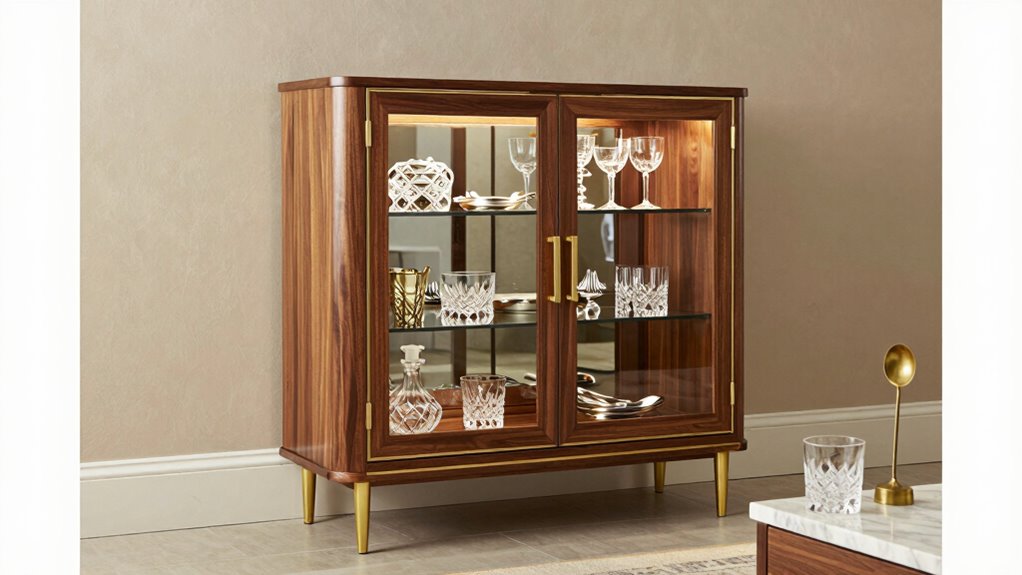 Choosing a bar cabinet for a small European apartment is like finding a jewel that fits perfectly in a tiny treasure chest. I look for sleek, compact designs with smart storage to maximize space without clutter. Light-colored woods or mirrored surfaces help reflect light, making the space feel bigger. I also prioritize multi-functional pieces that serve as both storage and decor, blending seamlessly into the elegant, minimalist vibe of European interiors.