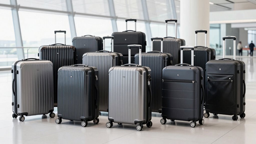 Ever wondered how to choose a carry-on suitcase that fits perfectly in overhead compartments yet offers enough space? First, it’s vital to check that the suitcase meets airline size restrictions, usually around 22 x 14 x 9 inches, including wheels and handles. I always measure the external dimensions to guarantee it will slide easily into overhead bins or under seats. The internal size matters too—making sure it can hold my clothes and essentials comfortably, whether or not it has expansion features. I also pay attention to the weight, aiming for a lightweight design that’s easy to maneuver while still packing everything I need. Finding a size that balances capacity and portability helps me avoid surprises at the gate and keeps my travel stress-free.