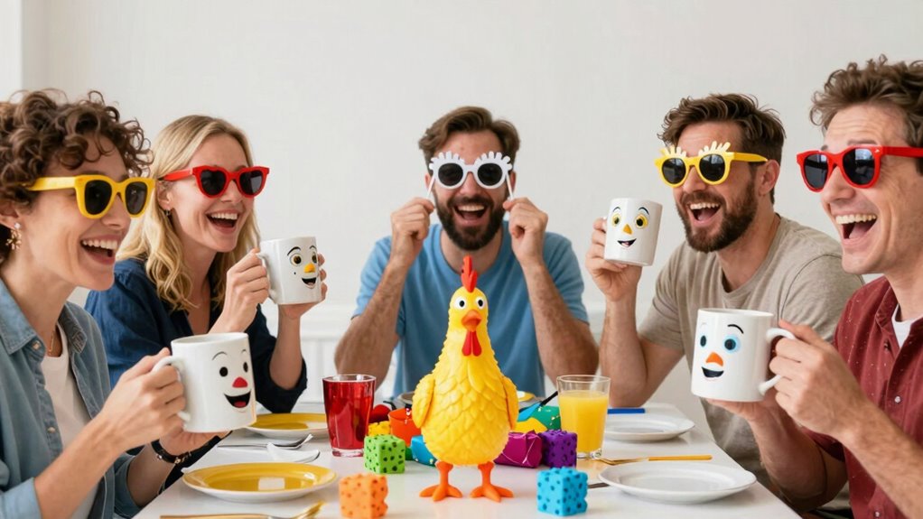 When choosing gag gifts for coworkers, I consider their personalities and the office environment. I look for fun, light-hearted items that won’t offend or embarrass anyone. I avoid overly personal or controversial gifts and stick to humorous, universal themes. I also pay attention to workplace policies to guarantee the gift is appropriate. Ultimately, I want something that’ll make them smile without crossing any boundaries, fostering a fun, friendly atmosphere.