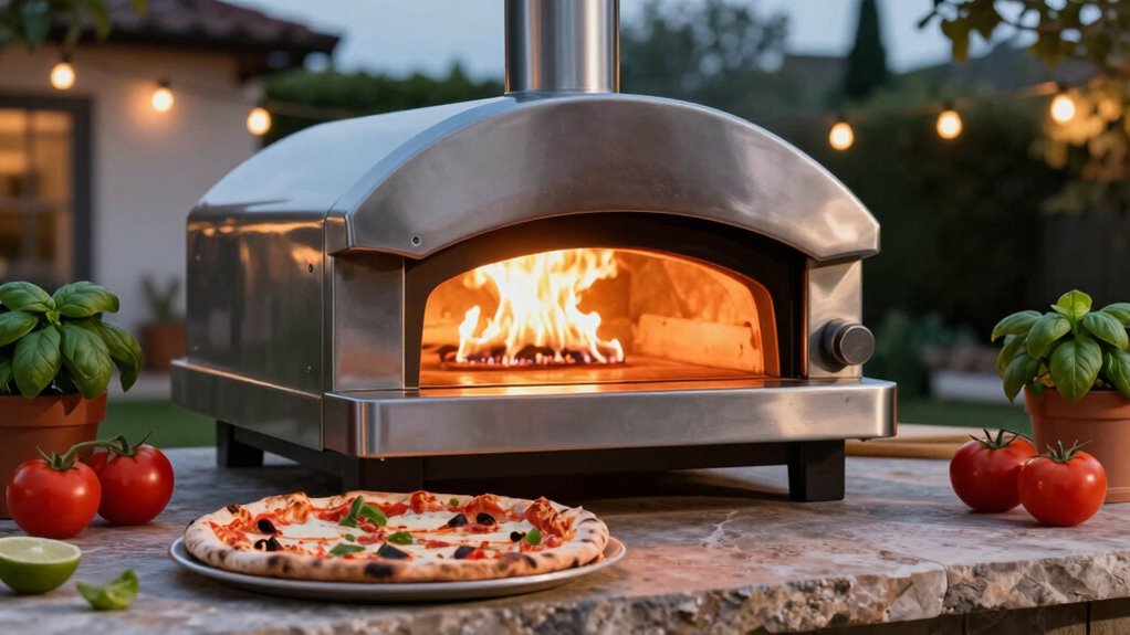 Ever wondered what safety features keep outdoor gas pizza ovens secure? I believe an automatic shut-off system is essential—it stops gas flow if leaks or malfunctions occur. A sturdy, weather-resistant construction prevents accidents, and proper ventilation ensures fumes don’t build up. Additionally, easy-to-access controls and clear safety instructions help prevent mishaps. These features give me peace of mind, letting me enjoy my pizza nights without worry.