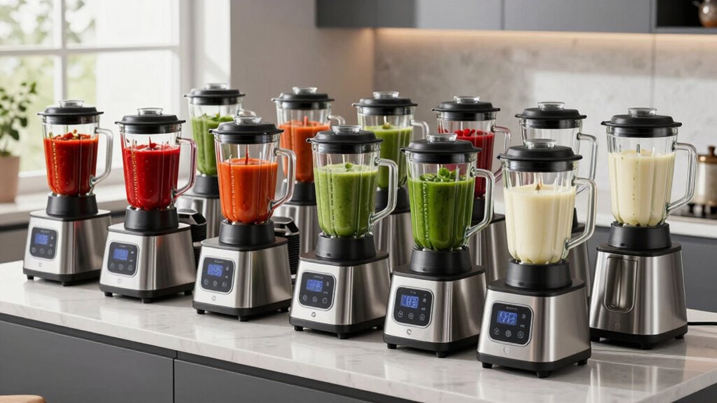 Choosing a high-power blender for Italian sauces and soups hinges on its ability to deliver exceptional blending strength. A blender with at least 1500 watts ensures it can efficiently crush tough ingredients like ice, frozen vegetables, and nuts, which are common in authentic recipes. High blade speeds of 25,000 RPM or more produce smooth, velvety textures vital for sauces and soups. Total Blending Technology, with multiple stainless steel blades, enhances the breakdown of fibrous ingredients, creating rich, homogeneous results. A powerful motor provides the torque needed to handle dense ingredients without overheating or stalling, ensuring consistent performance. The combination of high wattage and robust blades minimizes pre-soaking, saving time and preserving flavors and nutrients. Overall, these features guarantee superior blending strength for perfect Italian sauces and soups.