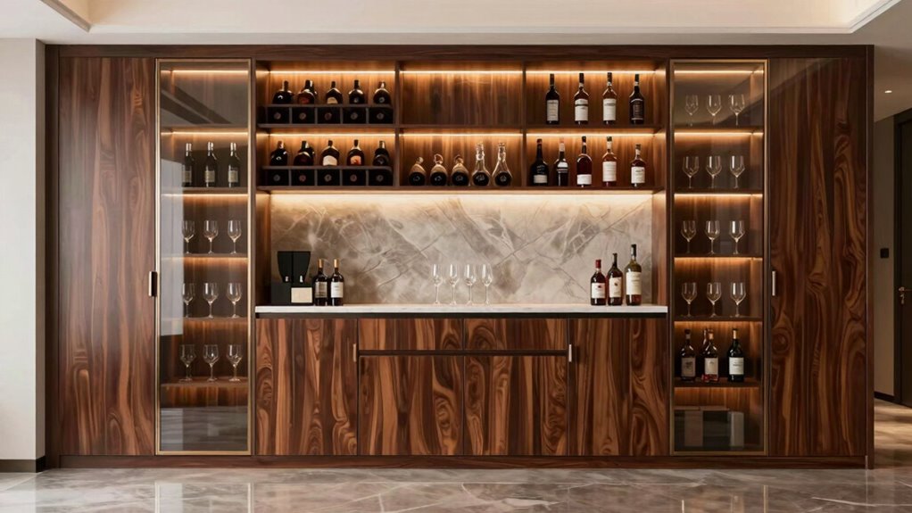 Did you know that over 60% of parents worry about their kids accessing alcohol at home? I always look for child-proof safety features in bar cabinets, and yes, many models now include locking mechanisms, safety latches, and secure hinges. These features help prevent accidents and keep wine and spirits out of children’s reach, giving me peace of mind while enjoying my home bar.