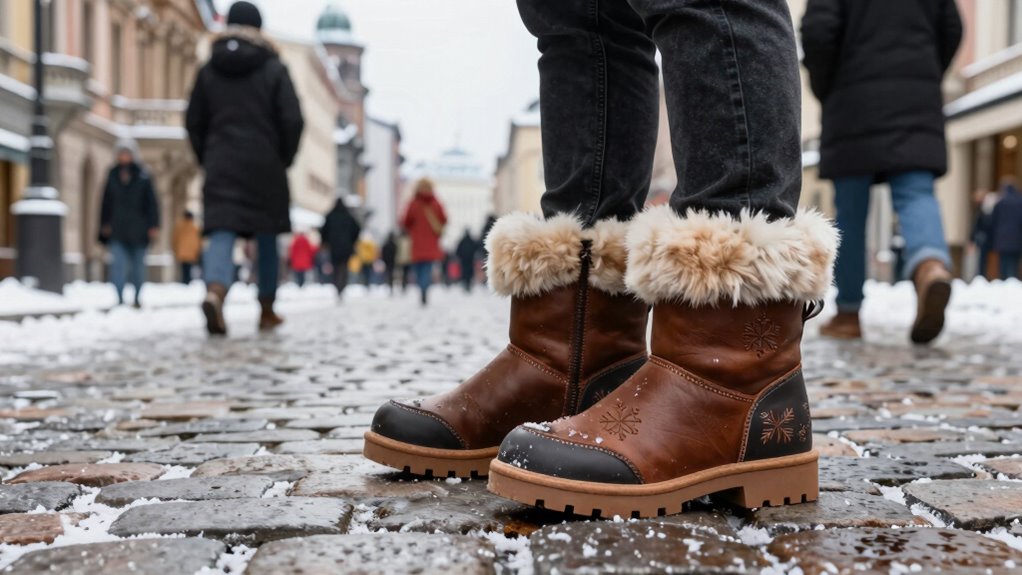 Ever wondered which soles grip icy streets best? I’d say look for boots with rubber soles that have deep, multidirectional treads. These provide maximum traction and prevent slips on slick surfaces. Some soles even feature softer rubber compounds for better grip. I always choose boots with these qualities because safety matters when steering through icy urban landscapes. Trust me, the right sole can make a huge difference in winter city adventures!