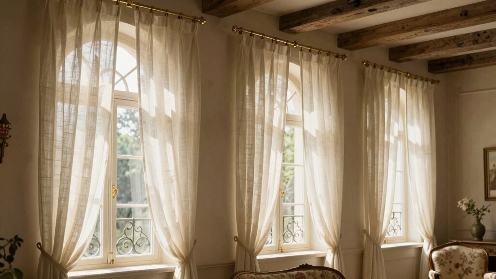 Linen curtains offer a beautiful way to control light and privacy in a French country interior, but their effectiveness depends on fabric choice and how you install them. Semi-sheer linen balances natural light filtration with privacy, letting daylight brighten your space while obscuring outside views. The openness of the weave impacts how much light filters through—tighter weaves offer more privacy, while looser weaves let in more light. Layering linen curtains with blinds or valances can provide extra control, perfect for adjusting privacy levels. Darker or lined linens also increase privacy at night. Proper measurement and installation are key to ensuring your curtains hang just right, preventing gaps that could compromise privacy. With these factors in mind, you can enjoy beautiful, functional linen curtains in your French country decor.