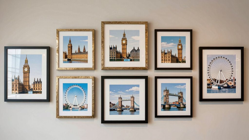 When evaluating London-themed wall art sets, the materials used play a crucial role in determining their durability and lifespan. Quality materials like canvas, wood, or eco-solvent inks ensure the art remains vibrant and intact over time. High-quality canvas or premium photo paper with fade-resistant inks resist discoloration from light exposure, keeping colors lively. Sturdy frames made of wood or metal provide essential support, reducing warping or damage as years pass. Water- and UV-resistant coatings on prints help prevent deterioration caused by moisture, dust, or sunlight. Proper mounting hardware and protective finishes further enhance stability and resist wear and tear. Selecting pieces made with durable materials guarantees your London-themed art will maintain its beauty and structural integrity for years to come.