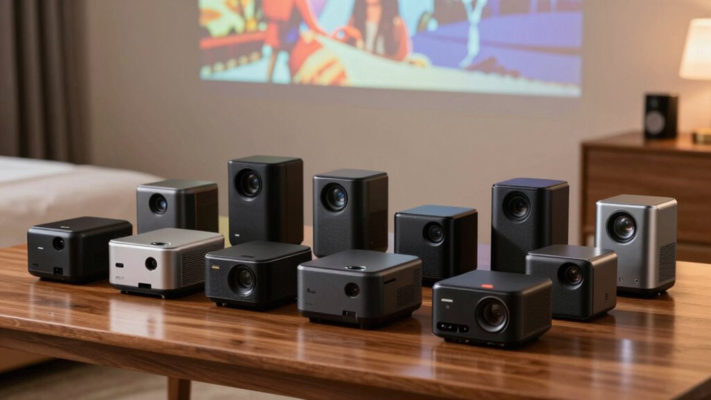 Ever wondered how long your mini projector can keep the entertainment going during your travels? A long-lasting battery, ideally over two hours, guarantees you can enjoy movies or presentations without frequent recharges. Portable projectors with rechargeable batteries give you the freedom to use them outdoors or in areas without power outlets, adding convenience. Battery capacity, measured in mAh, directly impacts how long you can use the device—higher capacity means longer playback. Power-saving features like auto-off timers and low-brightness modes help extend battery life, making your projector more reliable for extended use. Some models also support external power banks, allowing you to connect additional power sources for even longer sessions. Prioritizing battery life ensures uninterrupted entertainment wherever you go.