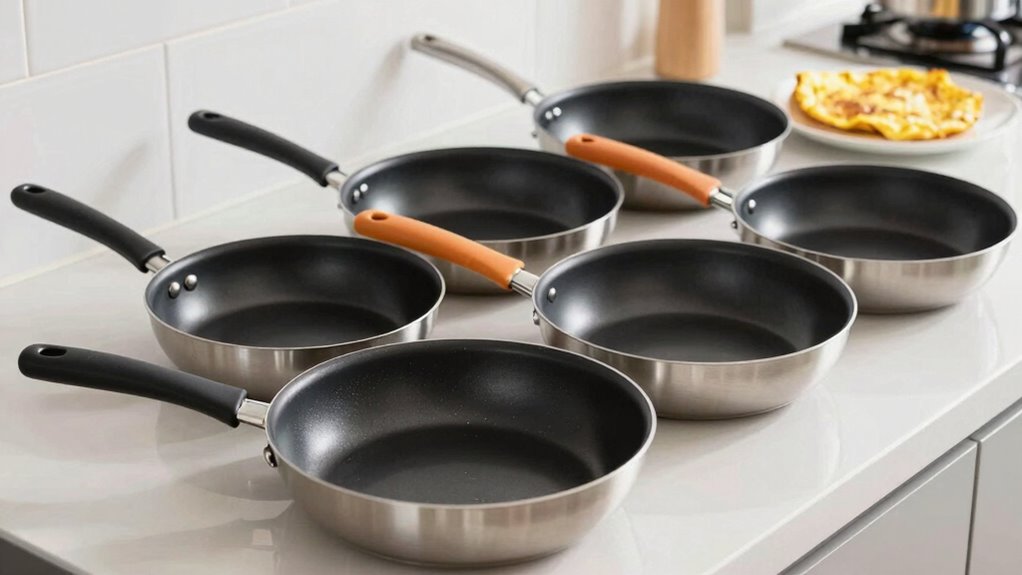 Selecting the right size and shape for your nonstick skillet set can make a noticeable difference in how easily you prepare French omelettes. Skillets range from 8 to 12 inches, so choosing the right diameter depends on your portion size and cooking style. Round pans with slightly flared sides are ideal for flipping and folding delicate eggs, while shallow, wide designs help spread eggs evenly and promote uniform cooking. Larger pans, like 10 or 12 inches, give you more space for fillings and allow you to make multiple omelettes at once. The shape impacts how effortlessly you can flip, fill, and serve your omelette. Picking the right size and shape ensures your cooking process is smooth, efficient, and tailored to your preferences.