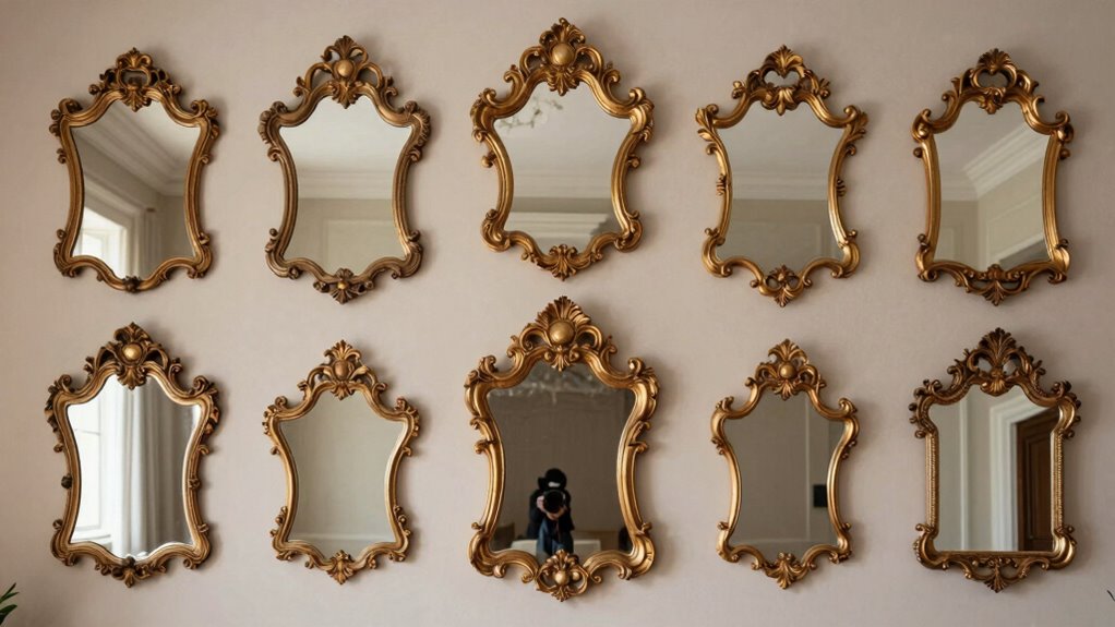 Selecting the right size and proportion for your ornate wall mirror is essential to creating a balanced and harmonious European-inspired space. I always measure the wall carefully to ensure the mirror fits comfortably without overpowering or seeming too small. The size should complement nearby furniture and allow for proper placement, enhancing the room’s aesthetic. Consider the ornate frame’s proportions; a well-balanced frame adds elegance without overwhelming the overall design. Larger mirrors with intricate detailing can become focal points, while smaller pieces work best as accents. It’s important that the height and width of the mirror relate well to other decorative elements in the room. Achieving this balance guarantees your mirror enhances the space, adding charm and sophistication without disrupting harmony.