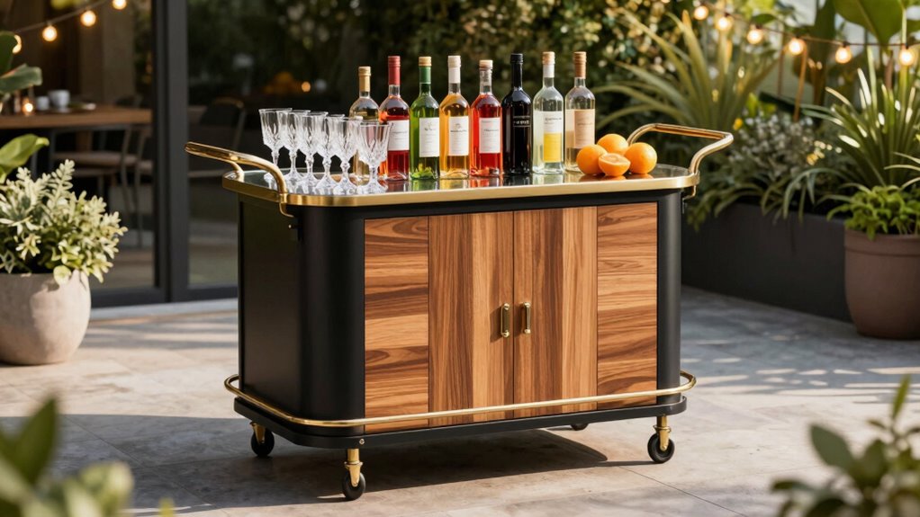Outdoor bar carts are like jewelry for your patio, adding sparkle and style. They elevate your space by blending functionality with design, making your outdoor area inviting and chic. Their materials and finishes can complement your decor, creating a cohesive look. Plus, they serve as focal points that draw attention and spark conversations. I love how these carts transform simple gatherings into memorable, Instagram-worthy moments.