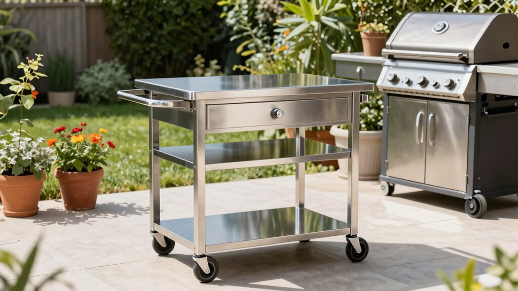 To keep my stainless steel surfaces looking sharp, I make it a point to clean them regularly with a soft cloth and a mild detergent. I avoid harsh chemicals that can cause damage. Wiping in the direction of the grain prevents scratches, and I polish with a stainless steel cleaner to restore shine. A little maintenance goes a long way to guarantee my outdoor kitchen cart stays gleaming for years to come.