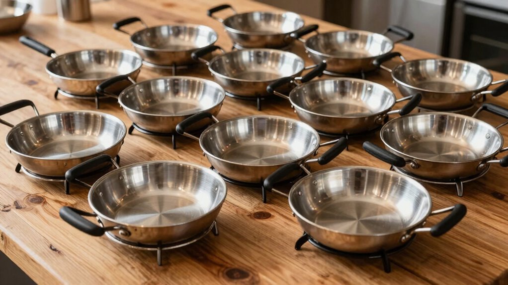 I believe the ideal material for a durable paella pan set is carbon steel. It heats evenly, develops a natural non-stick surface over time, and is resistant to warping. I’ve found it to be lightweight yet sturdy, perfect for outdoor cooking with a burner and stand. Plus, it ages beautifully, adding character to your cooking experience. Carbon steel really strikes the right balance of durability and performance for me.