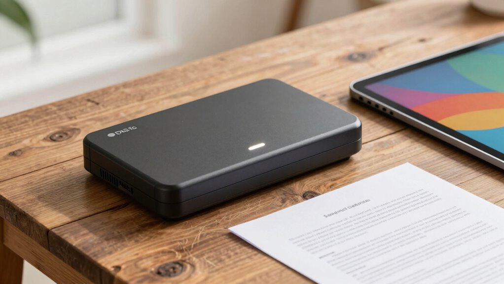 When choosing a portable scanner for travel, I pay close attention to its size and weight to guarantee it’s easy to carry. I also consider scanning speed, compatibility with my devices, and how I’ll power it up on the go. Finally, I look at image quality to make sure my scans are clear and usable.