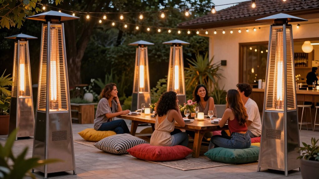Looking for the best propane patio heaters for outdoor parties in 2026? I’ve found top models that deliver 46,000 to 50,000 BTU, covering up to 20 feet with ease. These heaters are built from durable materials, often with features like wheels for easy mobility, safety shut-offs, and stylish designs that complement any outdoor space. If you keep exploring, you’ll discover detailed options to keep your gatherings warm and cozy all year round.