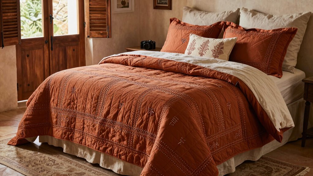 Choosing the right warm color palette is essential for creating an authentic Tuscan bedroom vibe. I recommend focusing on earthy tones like terracotta, burnt orange, olive green, and rich browns. These colors evoke a sun-drenched landscape and help establish a cozy, inviting atmosphere. Warm hues work beautifully with natural materials like wood and stone, reinforcing the rustic charm. To keep the space lively without feeling overwhelming, I suggest balancing vibrant shades with subtle accents. Selecting quilt sets in warm, muted tones allows for versatile pairing with other decor elements like curtains and rugs, completing the authentic Tuscan look. Remember, the goal is to create a space that feels warm, welcoming, and reminiscent of a rustic Italian retreat.