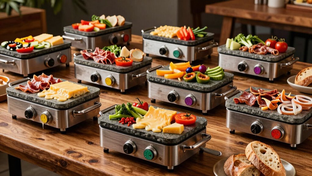 A raclette grill with a stone top offers impressive versatility, making it suitable for a wide range of dishes and cooking styles. I can grill meats, vegetables, and seafood, or get creative by making crepes and pancakes on the same appliance. Reversible plates and adjustable temperature controls let me switch easily between different cooking methods, expanding culinary options. The hot stone adds traditional grilling and stone cooking, giving me more ways to prepare meals. Non-stick surfaces on both the stone and plates make cooking and cleaning straightforward, encouraging experimentation with various recipes. With multi-functional designs, I can cook multiple dishes simultaneously, making it perfect for diverse cuisines and social gatherings. This versatility truly enhances my entertaining options and broadens my culinary repertoire.