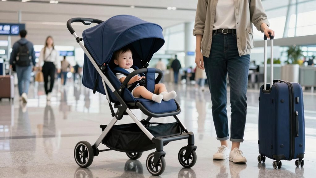 When selecting a stroller travel system for international trips, it’s crucial to take into account how well it integrates with air travel requirements. I look for a system that’s compact, lightweight, and folds easily to meet airline carry-on size restrictions. It should also be under the airline’s maximum weight limit for hand luggage, making handling less of a hassle. A self-standing fold is a big plus, allowing me to store and transport the stroller easily through airport terminals. I also verify that the included infant car seat is FAA-approved, ensuring safe and smooth air travel. Features like quick-release wheels and foldable components help streamline security checks and boarding, saving time and reducing stress. These considerations ensure my travel experience is as seamless as possible.