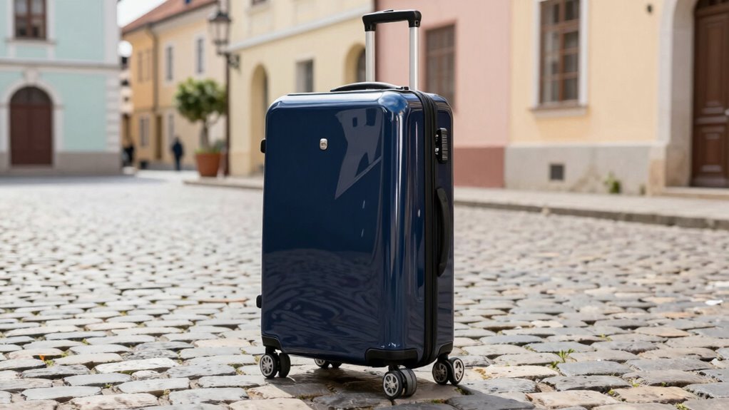 I believe hard-shell suitcases made from polycarbonate or aluminum are your best bet for cobblestone streets. They’re durable and resistant to vibrations, which helps protect your belongings. Polycarbonate is lightweight yet tough, making it perfect for maneuvering uneven terrain. Aluminum cases are sturdy and offer excellent shock absorption. Both materials can handle the constant jostling and vibrations of cobblestone streets, giving you peace of mind during your travels.