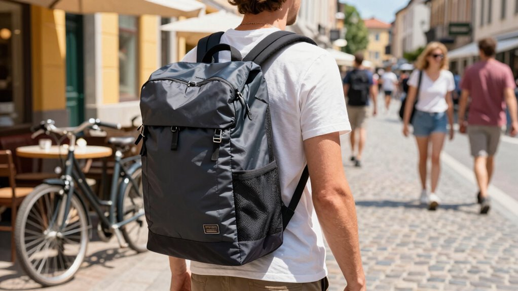 Selecting a backpack with breathable and ventilated materials can substantially improve comfort during those hot European summer days. These materials help reduce sweat buildup and keep your back cool, making extended wear more bearable. Look for backpacks featuring mesh panels and air flow channels, which promote better air circulation around your back. Lightweight fabrics like nylon or polyester with moisture-wicking properties also boost comfort, preventing excessive sweating. Proper ventilation isn’t just about comfort; it also protects your belongings from dampness by preventing heat and humidity from building up inside the bag. Additionally, adjustable straps and padded back panels with breathable mesh further enhance airflow, reducing overheating during long walks or sightseeing. Overall, breathable materials are essential for staying comfortable in Europe’s summer heat.