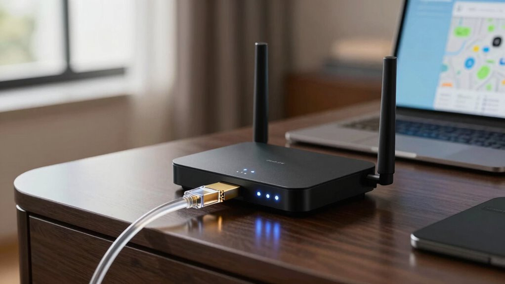 Choosing a travel router with Ethernet capabilities means paying close attention to the number and type of Ethernet ports it offers. At minimum, I look for at least one port to connect directly to wired hotel networks. Dual Ethernet ports are ideal because they allow me to connect to the hotel’s wired internet while simultaneously connecting my devices. For faster, more reliable wired connections, I prefer routers with Gigabit Ethernet ports over Fast Ethernet. It’s also important that the ports support standard RJ45 connectors for broad compatibility. Some routers feature auto-sensing Ethernet ports, which detect and adjust automatically for wired connections, making setup seamless. Overall, the right Ethernet port setup guarantees flexibility, speed, and ease of use during my travels.