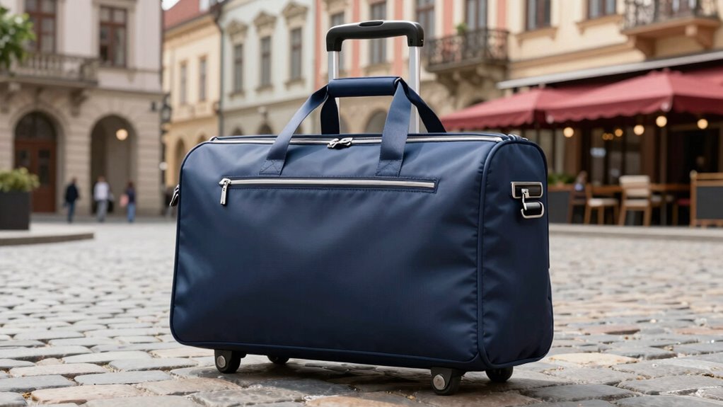 Focusing on weight and portability can make a significant difference in how smoothly your European travel experience unfolds. Lighter underseat roller bags, weighing between 4 to 7 pounds, are easier to carry and maneuver through busy airports and crowded streets. Their compact weight helps maximize packing space within airline personal item restrictions, which is especially crucial for budget airlines across Europe. A lightweight design also reduces fatigue on long travel days, making it easier to handle when steering transit stations or bustling city streets. Portable bags with telescopic handles and smooth-rolling wheels enhance ease of movement, minimizing physical strain. Choosing a bag with ergonomic features and minimal weight guarantees comfort, whether you’re pulling or carrying it, even when fully packed.