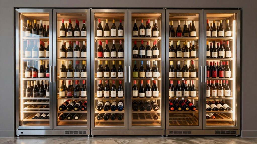 UV-protected glass doors aren’t strictly necessary, but I highly recommend them for Italian wine storage. They help shield your wines from harmful UV rays that can degrade flavors and aging potential. Plus, they allow you to display your collection beautifully. If you’re serious about preserving your wine’s quality, investing in UV-protected doors is a smart move that offers both protection and aesthetic appeal.