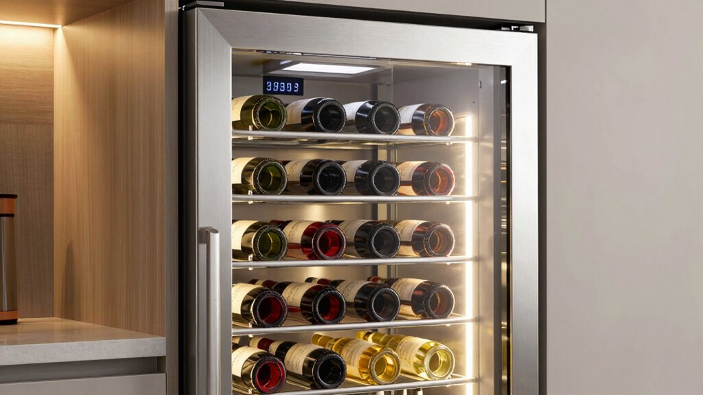 Have you ever wondered how a wine fridge’s temperature zones impact your wine storage? The number of zones determines how well you can store different wine types at their ideal temperatures. Dual-zone models let you keep reds around 55°F and whites closer to 45°F, preventing flavor compromise. Single-zone units maintain one consistent temperature, which works if you mostly drink one style. Precise digital controls, adjustable in 1°F increments, help fine-tune conditions for perfect preservation. To guarantee the temperature zones are effective, look for independent thermostats and dedicated cooling systems for each zone. This setup prevents temperature fluctuations and guarantees your wine stays at its best. Choosing the right zone options means your wine ages properly and flavors stay true.
