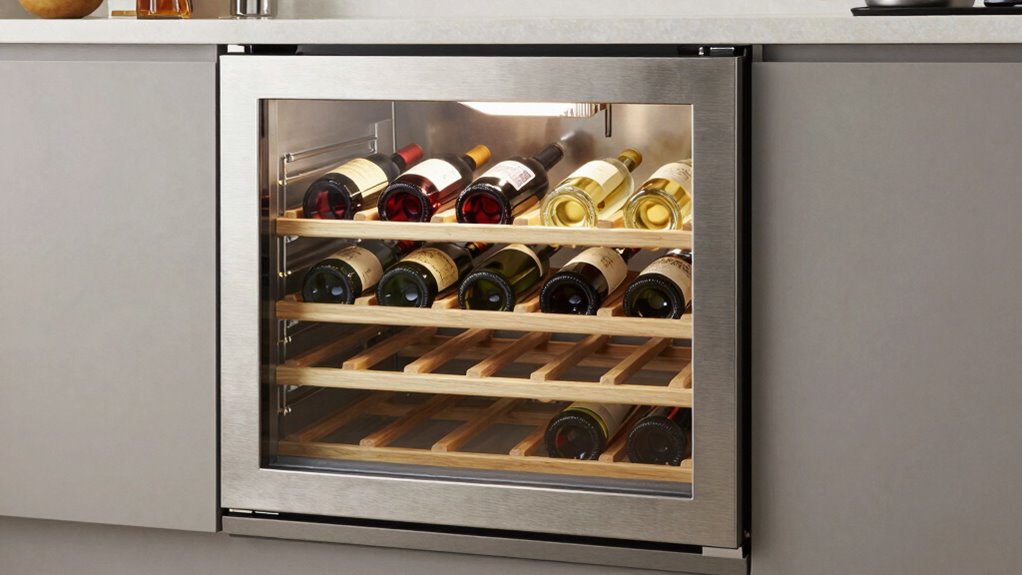 Lighting options play a significant role in how your wine fridge looks and functions. LED lighting is an excellent choice because it’s energy-efficient and doesn’t produce heat that could spoil your wine. Many models feature adjustable LED lights, allowing you to customize brightness and color, creating the perfect ambiance. Blue LED lighting is especially popular for its soft glow that highlights bottles while minimizing UV exposure, which can degrade wine over time. Some fridges even include sensor-activated lighting that turns on when you open the door, saving energy and extending bulb life. The placement and style of lighting also impact the fridge’s overall aesthetic, making it an important factor to contemplate when selecting a model that fits your space and style preferences.