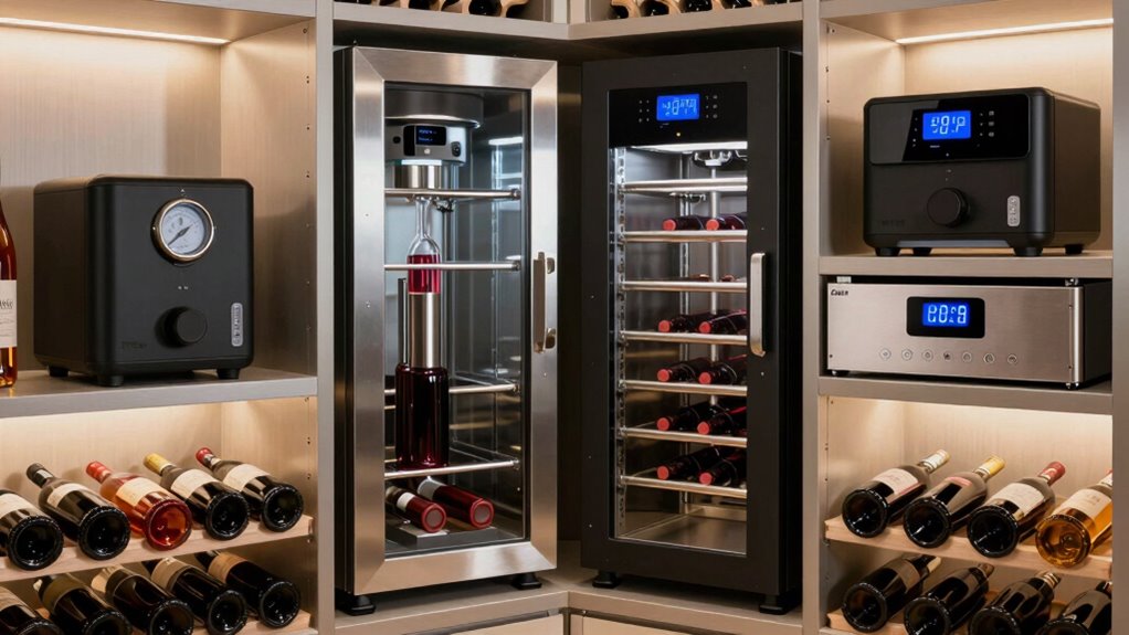 Think of wine preservation methods as tailored suits; each fits certain wine varieties better. I’ve found that vacuum systems work wonders for reds, keeping their rich flavors intact, while inert gas preservation gently shields whites from oxidation. For delicate sparkling wines, inert gas is my go-to, preserving that lively bubble. Choosing the right method depends on the wine’s character, ensuring each sip remains as delightful as the day it was opened.