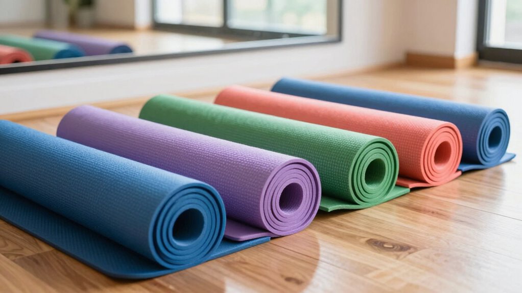 Think of your yoga mat as your trusty trail guide—thickness matters! For beginners, I recommend a mat around 4-6mm thick. It strikes a perfect balance: sturdy enough to cushion your joints without feeling like you’re walking on marshmallows. Too thick, and your stability might suffer; too thin, and your knees scream for mercy. Find that sweet spot, and you’ll glide into your practice with confidence and comfort.